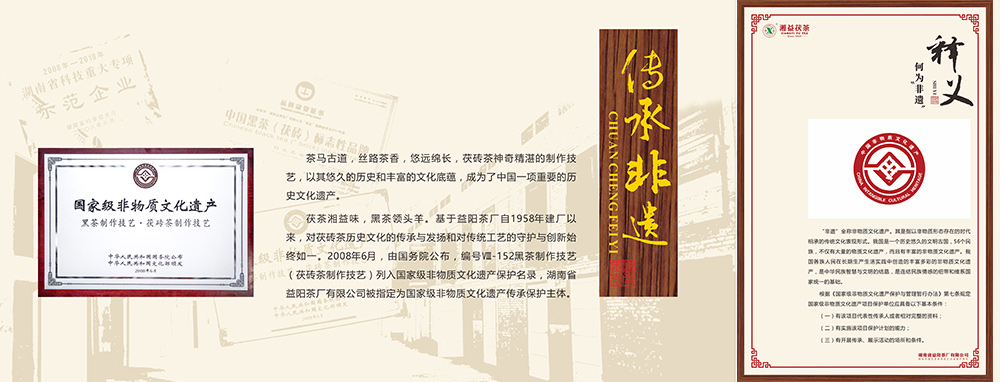 國家非物質(zhì)文化遺產(chǎn)傳承保護(hù)單位,2008年益陽茯磚茶制作技藝被列入國家級非物質(zhì)文化遺產(chǎn),而益陽茶廠是這技藝的唯一傳承保護(hù)單位。