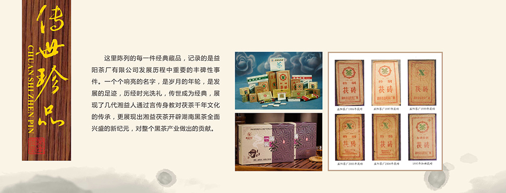 這里陳列的每一件經(jīng)典藏品,記錄的是益陽茶廠有限公司發(fā)展歷程重要的豐碑性事件,一個個響亮的名字,是歲月的年輪,是發(fā)展的足跡,歷經(jīng)時光洗禮,傳世成為經(jīng)典,展現(xiàn)了幾代湘益人通過言傳身教對茯茶千年文化的傳承,更展現(xiàn)出湘益茯茶開辟湖南黑茶全面興盛的新紀(jì)元,對整個黑茶產(chǎn)業(yè)做出的貢獻(xiàn)。